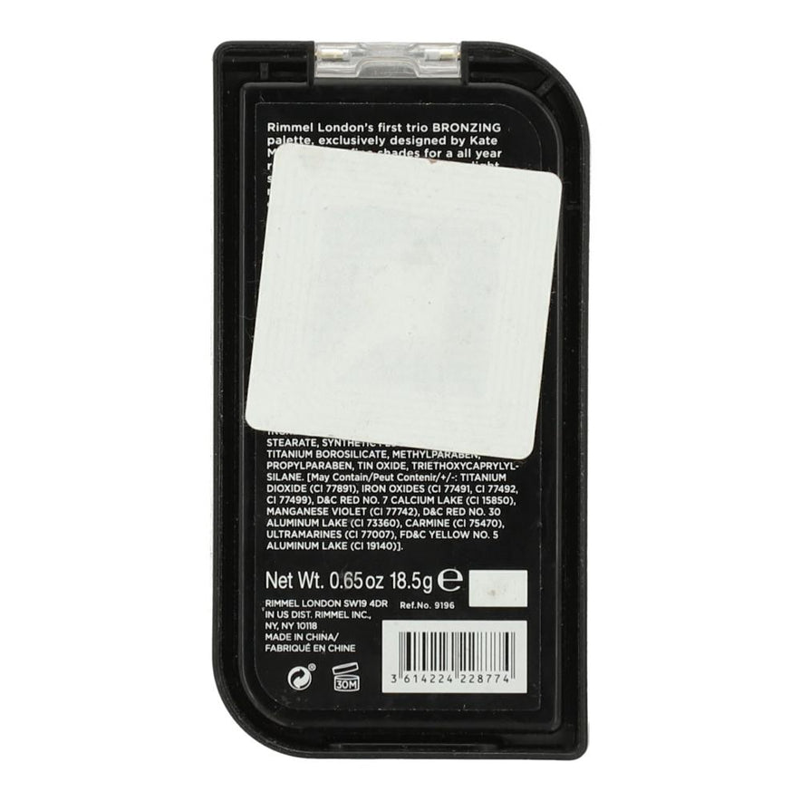 Want the London look? First trio BRONZING palette, exclusively designed by Kate Moss. Can be worn on bare skin or over foundation. Apply with a light sweeping motion to cheeks, forehead, nose and chin. 3 ultra-fine shades for a all year round tanned look. Rimmel London is an inner confidence that how we look is always cool, irreverent, never predictable and always evolving. Rimmel is not perfection or intimidating, it is like London: young, urban, eclectic, edgy. It is an expression with no rules, it is real, it is accessible. GET THE LONDON LOOK.