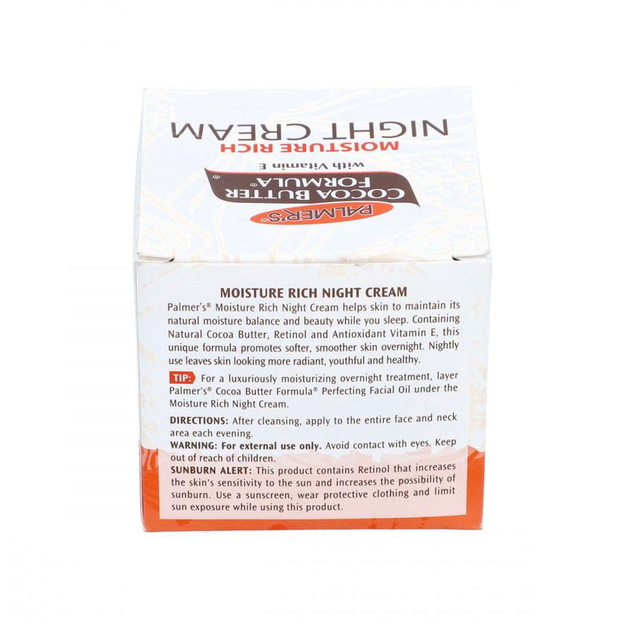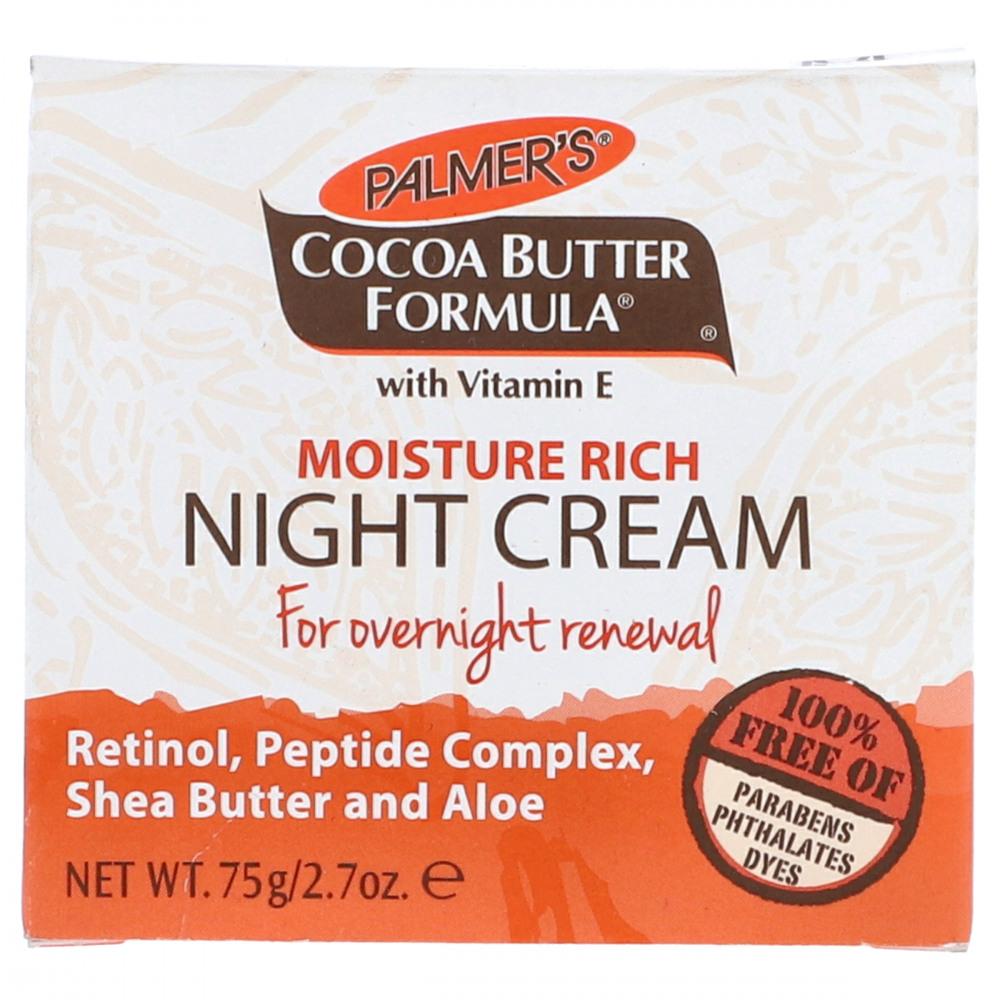 Palmer's Cocoa Butter Formula Moisture Rich Night Cream helps skin to regenerate while you sleep. Containing Natural Cocoa Butter, Retinol and antioxidant Vitamin E, this unique formula promotes softer, smoother skin overnight. Nightly use leaves skin looking more radiant, youthful and healthy.